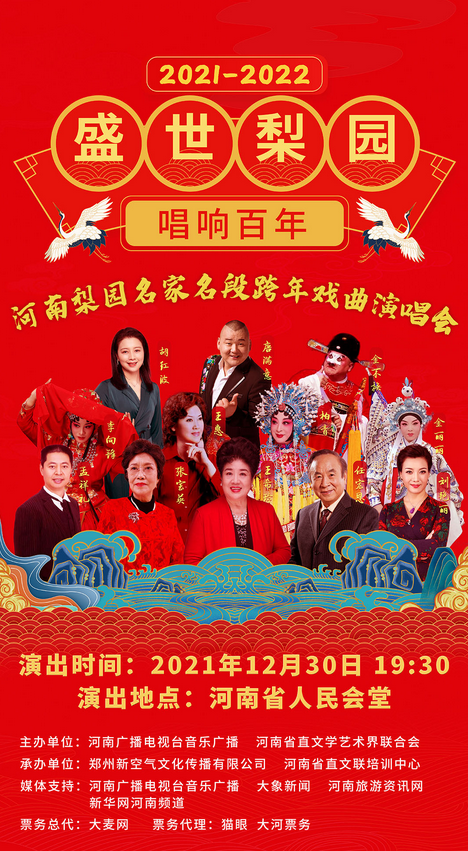 2021-2022河南梨園名家名段跨年戲曲演唱會(huì)即將于12月30日在河南省人民會(huì)堂舉辦!此次演出響應(yīng)“弘揚(yáng)黃河傳統(tǒng)文化, 唱響盛世共迎新年”的號(hào)召,以“盛世梨園,唱響百年”為主題,為廣大票友帶來(lái)一場(chǎng)名家云集、經(jīng)典薈萃的視聽(tīng)盛宴!