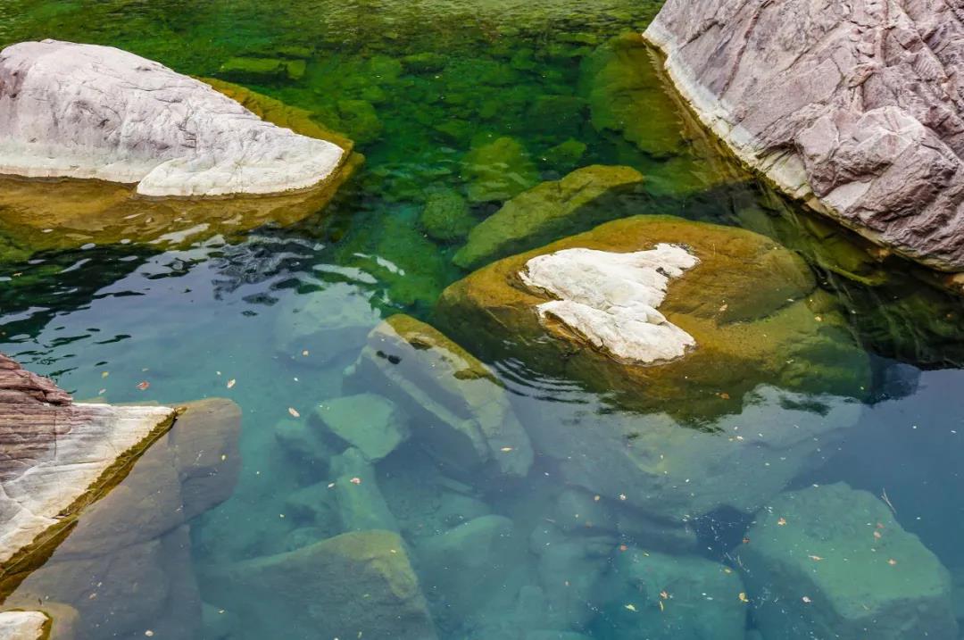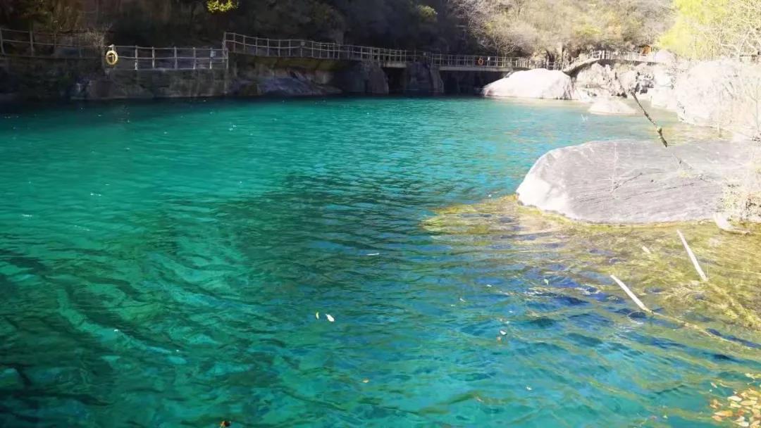 游龍灣碧藍通透澄澈無比,就像是盤踞在蜿蜒的寶泉曲峽的一條碧藍巨龍;翡翠海猶如一塊鑲嵌在寶泉山峰之間的自然藍寶石,用自己的獨特展示寶泉的秘境之所在!從水面看水中的植物,就好像是在看一個藍色的琥珀,水中的景物就像是久遠流傳下來的景物,讓人看的出神。