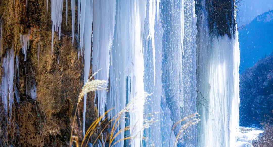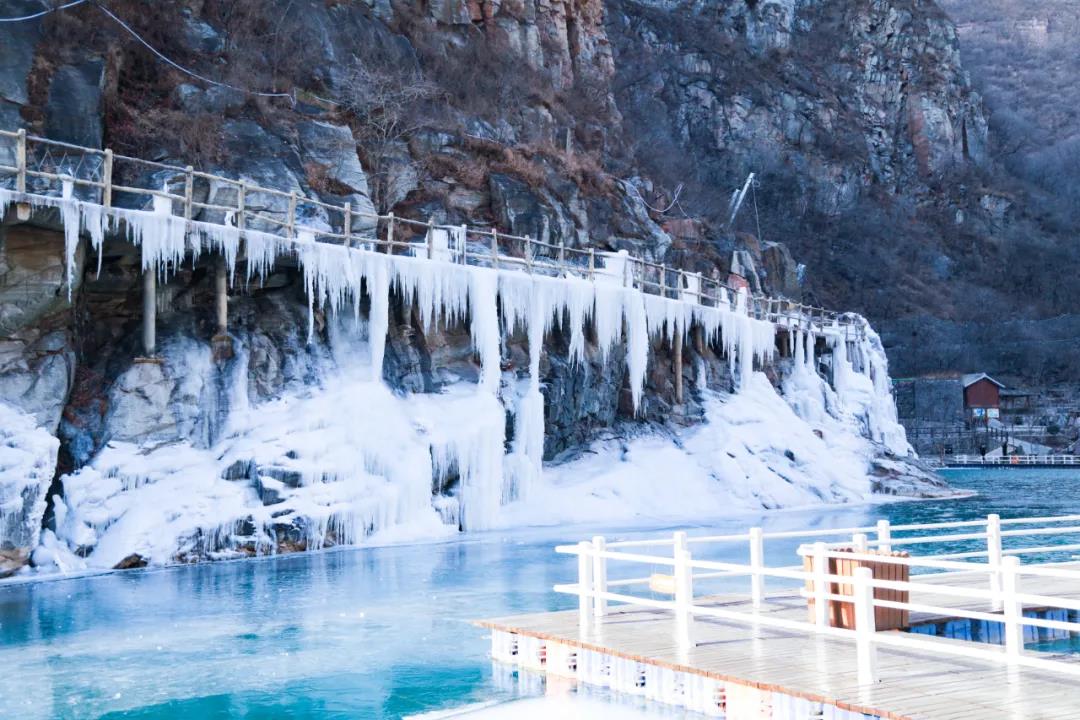 冷風吹過,氣溫逐降,寶泉中潺潺的流水凝結成冰,形成了漂亮的冰掛景觀。奪目的冰掛晶瑩剔透,精美絕倫,宛如仙境。