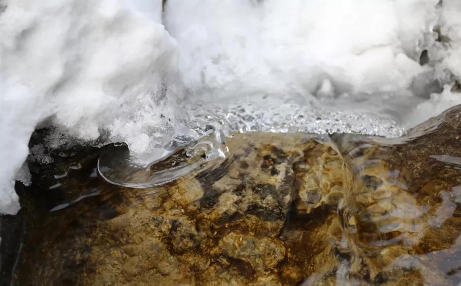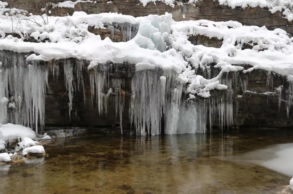夏日里溪水叮咚,潭水清澈見底。冬季碧水依舊在,巖崖上方增添了不規(guī)則的冰雪圖案相伴。