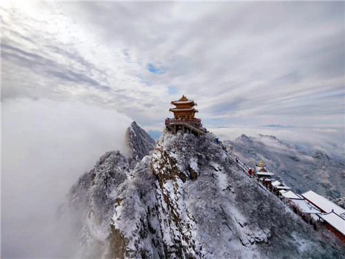 白云山玉皇頂?shù)挠窕书w上覆蓋了一層白雪,紅底的金頂染上雪花,彩色的漆畫紋路更加鮮明,令整座大殿顯得莊嚴(yán)恢宏。