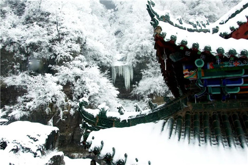 天仙碧玉瓊瑤,點點洋花,片片鵝毛,叢林古樹傲立群峰之上,好一幅雪后江山圖。