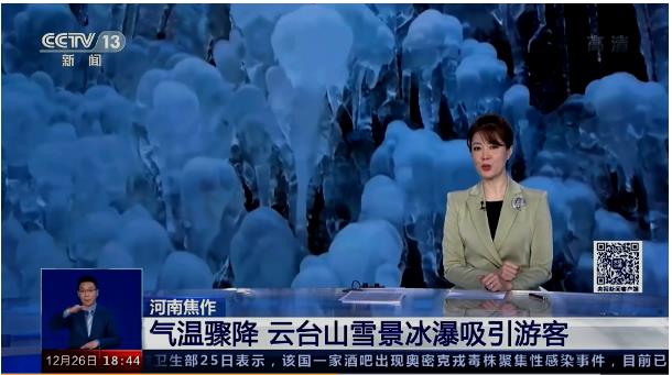 云臺(tái)山2000米冰瀑群美到央視啦!12月26日18時(shí)43分,央視新聞?lì)l道《共同關(guān)注》報(bào)道云臺(tái)山冰瀑雪景。