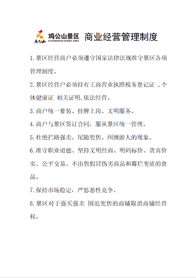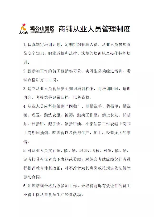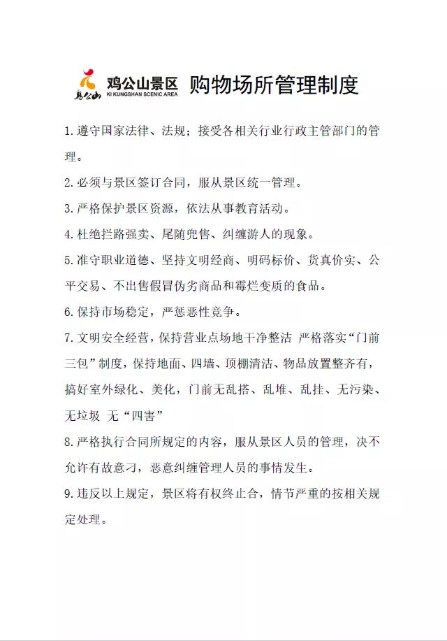 雞公山景區(qū)對各經(jīng)營場所所有商品經(jīng)營從業(yè)人員采用統(tǒng)一的管理措施,包括《景區(qū)商品價格管理制度》、《景區(qū)計量管理制度》、《景區(qū)經(jīng)營從業(yè)人員守則》,并與商品經(jīng)營從業(yè)人員簽訂協(xié)議,對違反協(xié)議的按規(guī)定進行處罰。