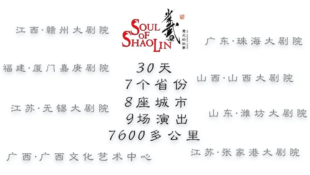 此次巡演先后歷時30天,行經(jīng)7個省份8座城市,成功舉辦9場演出,總行程7600多公里,涵蓋了粵港澳大灣區(qū)、長江三角洲地區(qū)、中部地區(qū)。劇組成員不顧奔波勞累,以飽滿的狀態(tài)、高質(zhì)量的演出為當(dāng)?shù)赜^眾展示中國功夫的獨(dú)特魅力,進(jìn)一步擦亮老家河南、中國功夫“金名片”。
