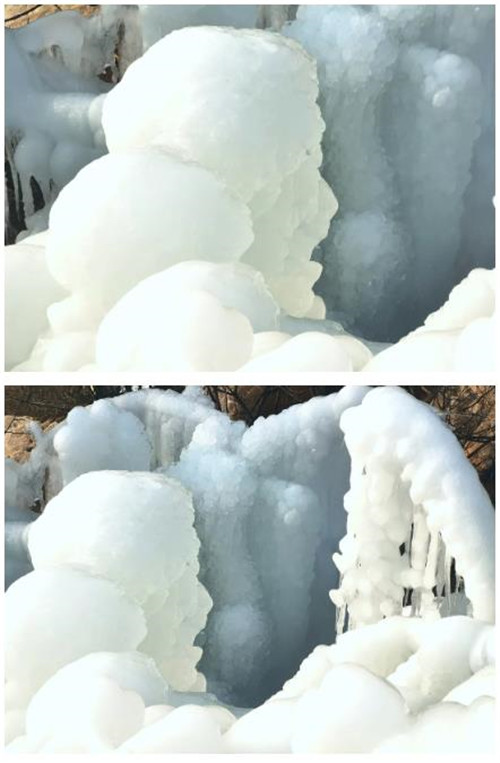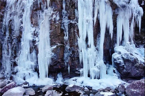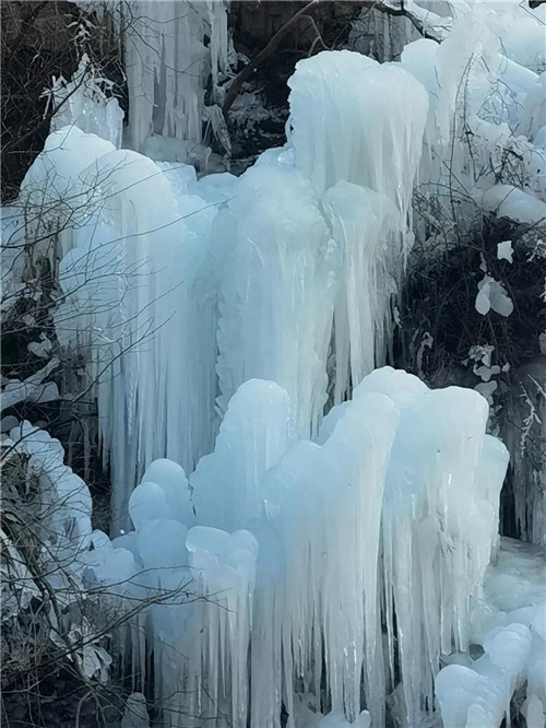 純白的冰瀑化身冰姑娘,讓蕭瑟的冬天多了幾分妖嬈。凝結(jié)的冰掛和瀑布流水和諧共處,形成一幅美麗和諧的自然畫(huà)卷。