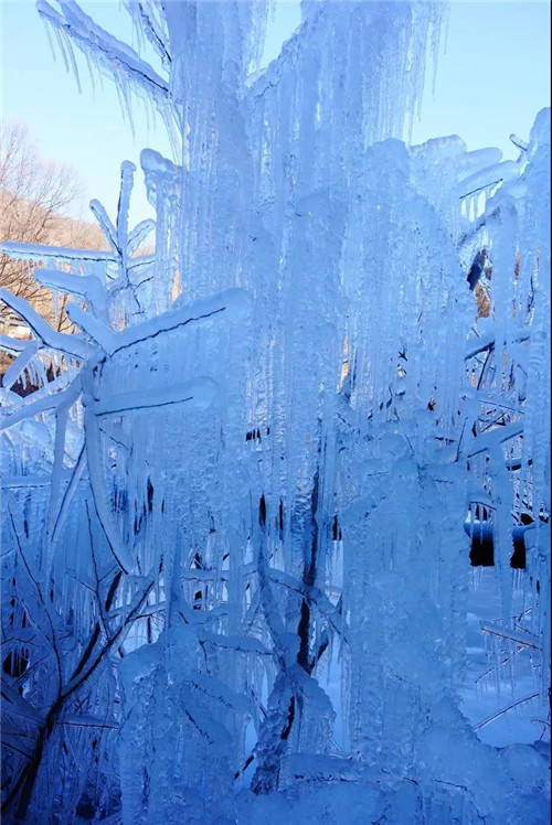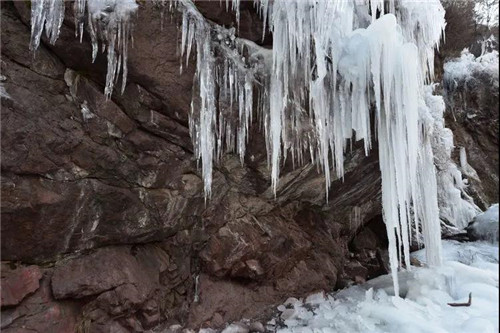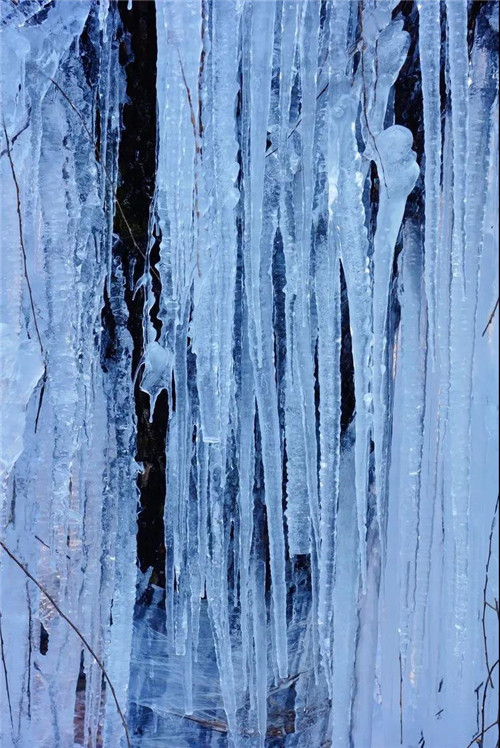 “遠(yuǎn)看如白練,近看似利劍”,大概就是形容這般場(chǎng)景了。遇上陽(yáng)光,冰掛又會(huì)發(fā)生折射現(xiàn)象,像極了天然水晶,顯得格外耀眼好看。