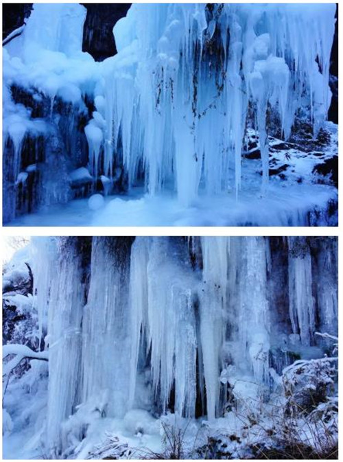 冰掛都是山泉水結(jié)成,據(jù)說(shuō)可以吃,你們?nèi)サ脑捒梢郧倪溥涞脑囋嚒?/p>