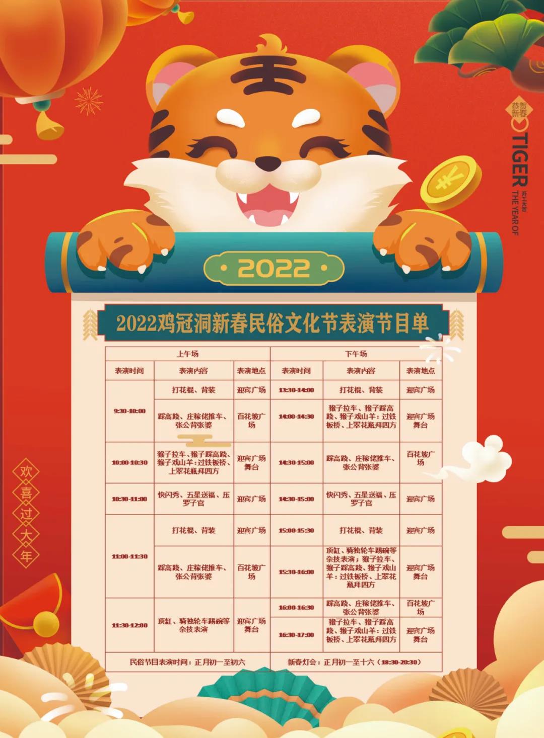 新春佳節(jié)到來(lái),為進(jìn)一步豐富群眾文化活動(dòng),弘揚(yáng)中華優(yōu)秀傳統(tǒng)文化,營(yíng)造一個(gè)歡樂(lè)祥和的節(jié)日氛圍,雞冠洞景區(qū)將嚴(yán)格按照市、縣疫情防控相關(guān)要求,于2022年正月初一至正月初十六,為廣大市民朋友推出精彩民俗表演和新春燈會(huì)。