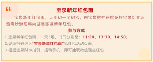 寶泉新年紅包雨!大年初一到初六天天派送!入園即可搶紅包,由寶泉財神在桃花坪寶泉新春冰雪奇妙游現(xiàn)場向游客派發(fā)新年紅包。