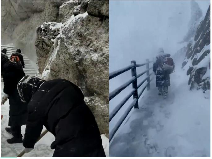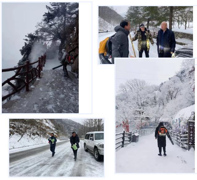 雪景雖美,道路安全更重要。景區(qū)員工在山上、山下主要路段、易滑地段、步行區(qū)域開展撒鹽、掃雪、除冰工作。冰天雪地中,員工手持著掃把和鏟雪鏟、吹雪機等除雪工具,相互配合,積極協(xié)作,保障道路安全暢通和游客行車安全。