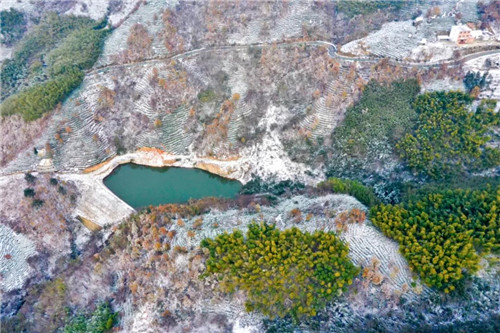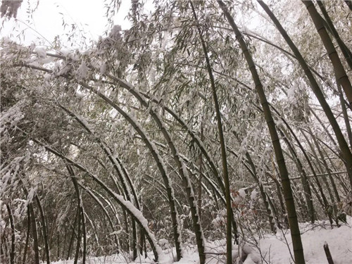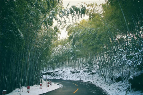 遠(yuǎn)處的山峰、近處的竹林,都被白雪覆蓋,純白色的雪花像綻放的禮花,在天地間肆意飄灑,留下一片晶瑩的白。