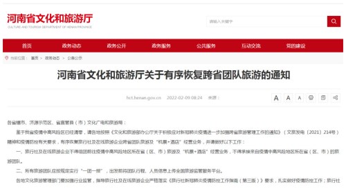 2月9日,河南省文化和旅游廳發(fā)布關(guān)于有序恢復(fù)跨省團(tuán)隊(duì)旅游的通知,全文如下:
