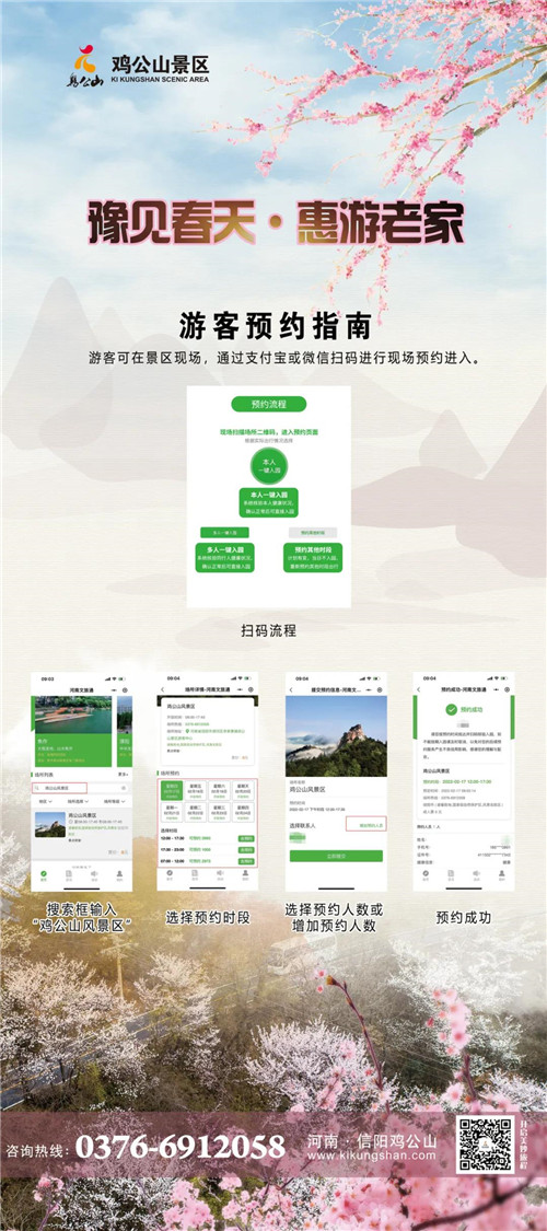 打開支付寶或微信掃一掃,搜索“河南文旅通”小程序→搜素“雞公山風景區(qū)”進行預約→添加同行人員→查看是否預約成功(點擊“我的”在我的預約界面查看待使用)。