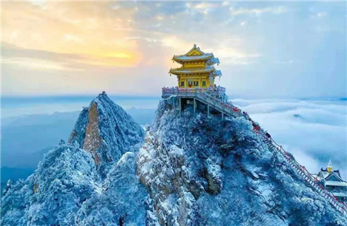 俗話說,站得高望得遠(yuǎn)。站在海拔2217米的最高處,拍攝冬季限定的老君山藍(lán),看遠(yuǎn)處云卷云舒,更有陽光映照下的金頂?shù)烙^群金光耀目、恢弘無比。