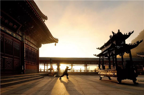 透過回廊上的廊窗結(jié)構(gòu),日出日落美的如同一幅畫,院內(nèi)練功的道者,也成了畫中人。