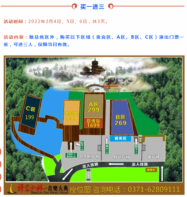 關注“禪宗少林音樂大典”官方微信公眾號點擊圖片進行或直接掃碼購票;或通過美團、攜程、驢媽媽、去哪兒網、八戒游世界、輝煌票務、奧米優(yōu)選、商河票務等OTA平臺及省內各大旅行社購票。