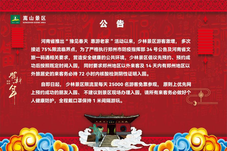 自今日起,嵩山少林景區(qū)限流至每天25000名游客免票參觀,請廣大游客提前進行網(wǎng)上預(yù)約,以免給您的出行帶來不便。