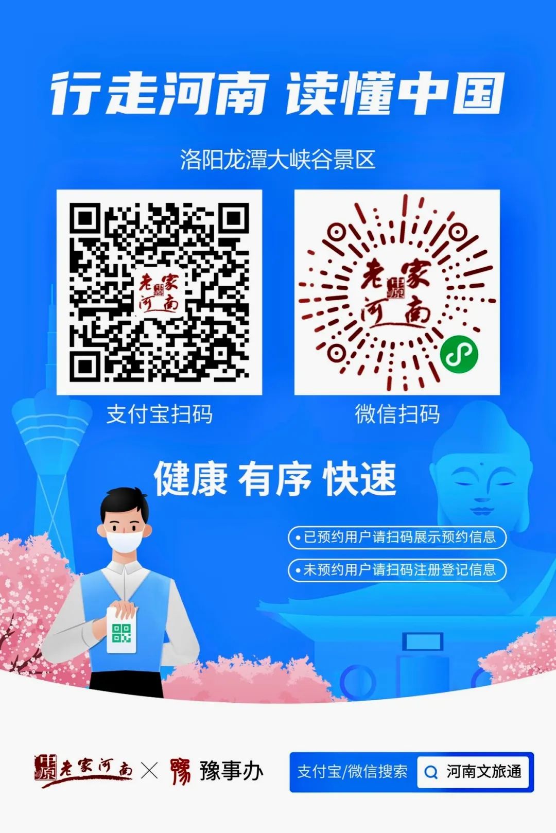 2022年2月16日—3月31日,洛陽龍?zhí)洞髰{谷景區(qū)對全國游客免門票開放,掃描圖中二維碼,完善信息即可預(yù)約(也可現(xiàn)場掃碼預(yù)約),咨詢電話:0379-69721188。