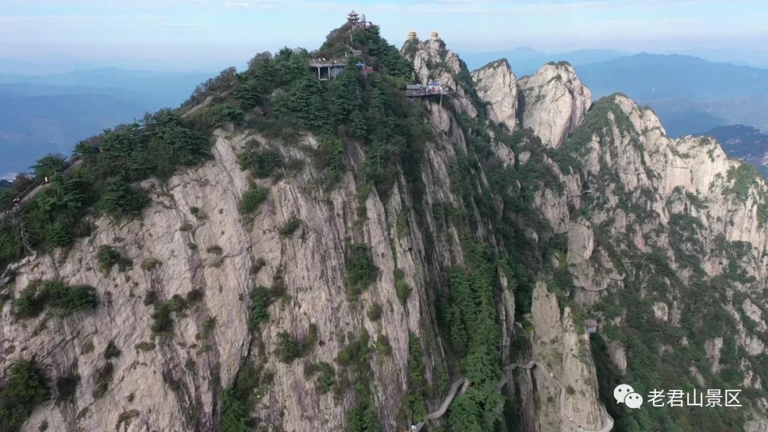 馬鬃嶺作為老君山最高峰,自然是拍照的最佳位置,畢竟站得高望得遠,取景自然是最大的。此處也是觀賞云海,欣賞日出、日落的好地方,往東有老君山道觀群作拍攝前景,往西有中鼎山、鼎室山作拍攝前景。如果夏天在太陽落山前趕到這里,云霧繚繞的天氣下,說不定還能看到神光。