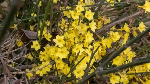 連翹盛開時滿枝金黃,芬芳四溢,令人賞心悅目,大片的連翹枝條翠綠,株枝間朵朵嫩黃的連翹花,與初春相似迎著初冬颼颼寒風競相綻放。
