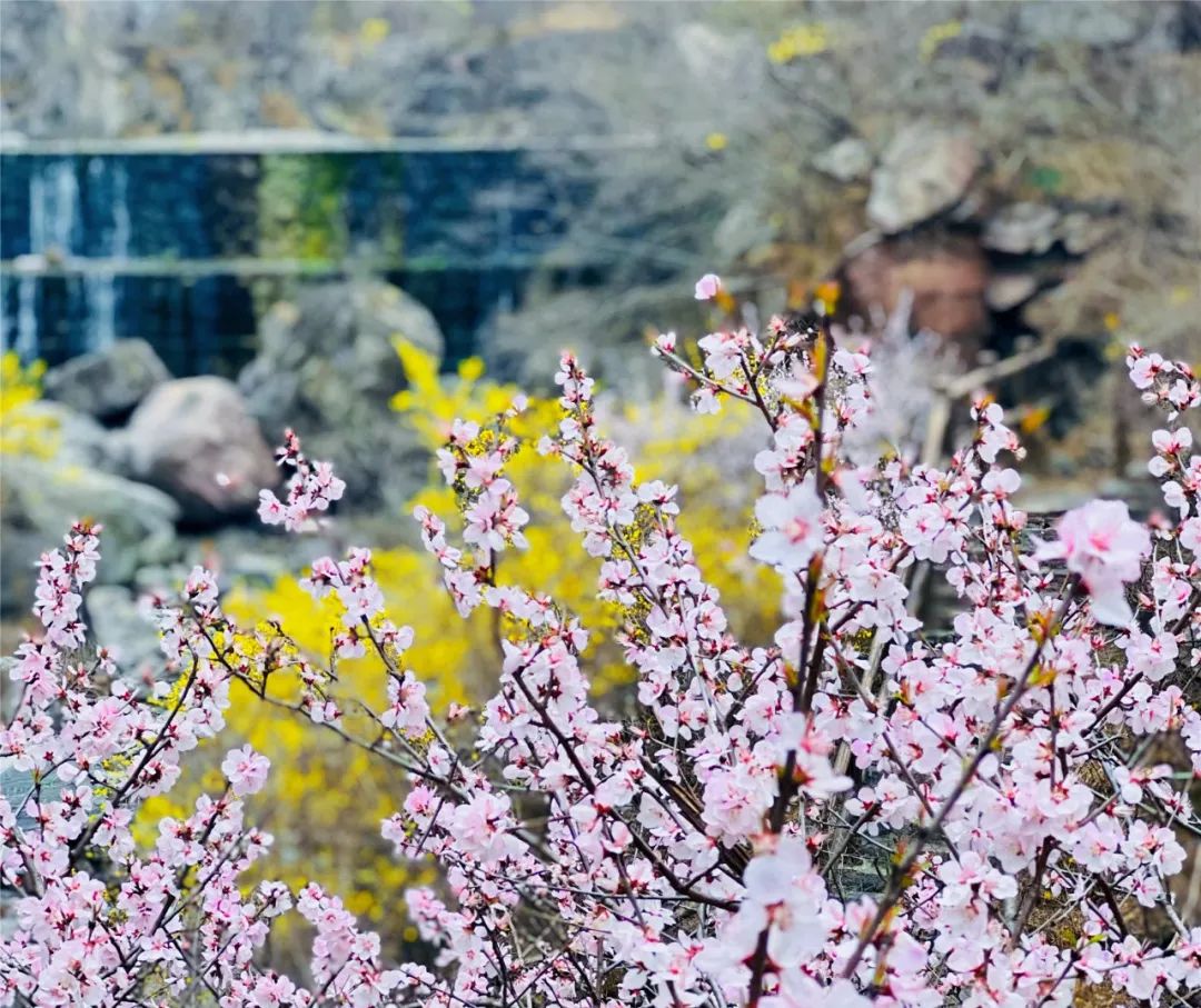 連翹花,陽春三月便開,開時香氣淡雅、滿枝金黃,金黃色的花朵與點綴其間的桃樹、杏樹紅粉相見,為春日帶來鮮活的氣息。