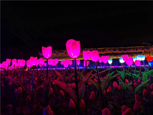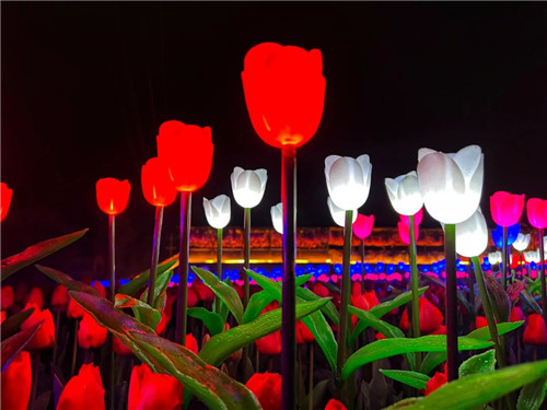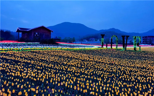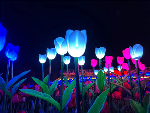 與白天的花海一樣,夜晚的花千谷也有數(shù)不清的顏色,白的、紅的、藍的...各色的燈光郁金香在夜幕中熠熠生輝。