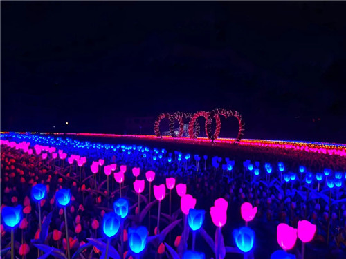 漫步光影,仿佛置身于童話之中,白的、藍的、紅的各色的燈光,把這片花海點綴的更加迷人,或許走過這個彎,浪漫就會和你碰面。