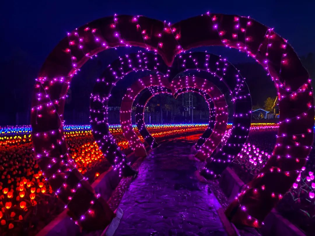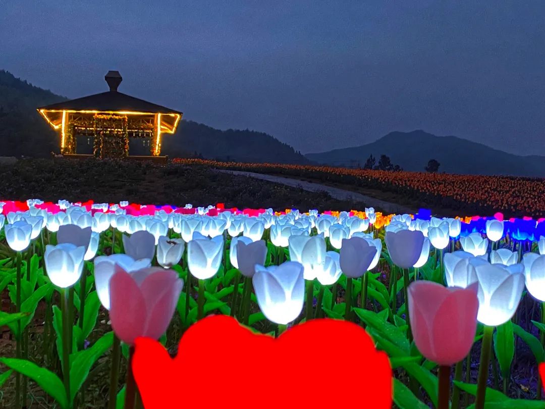 彩燈夜放花千谷,七彩燈光花海,配合百萬郁金香,展示一種別樣的觀賞體驗。