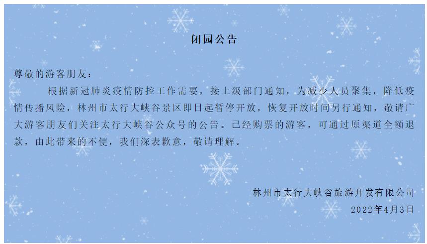 根據(jù)新冠肺炎疫情防控工作需要,接上級部門通知,為減少人員聚集,降低疫情傳播風險,林州市太行大峽谷景區(qū)即日起暫停開放,恢復開放時間另行通知,敬請廣大游客朋友們關(guān)注太行大峽谷公眾號的公告。已經(jīng)購票的游客,可通過原渠道全額退款,由此帶來的不便,敬請理解。