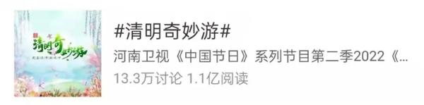 春景交至,天地清明。4月4日晚河南衛(wèi)視#清明奇妙游#正式播出。節(jié)目還未播出就沖上了微博熱搜,#清明奇妙游#話(huà)題閱讀量已超1億。
