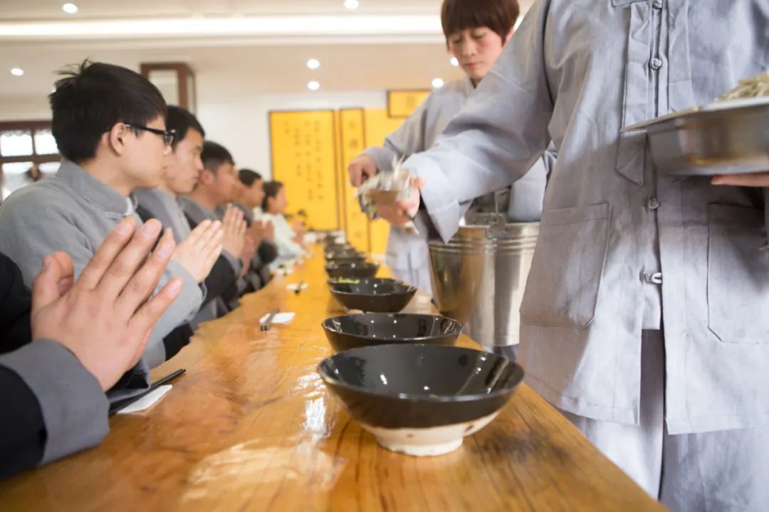 “過堂”即漢傳佛教叢林中的“吃飯”。過堂不但要求 “食素”,而且還要“觀心”。觀心有“五觀”:一是思念食物來之不易,二是思念自己德行有無虧缺,三是防止產(chǎn)生貪食美味的念頭,四是對(duì)飯食只作為療饑的藥,五是為修道業(yè)而受此食。