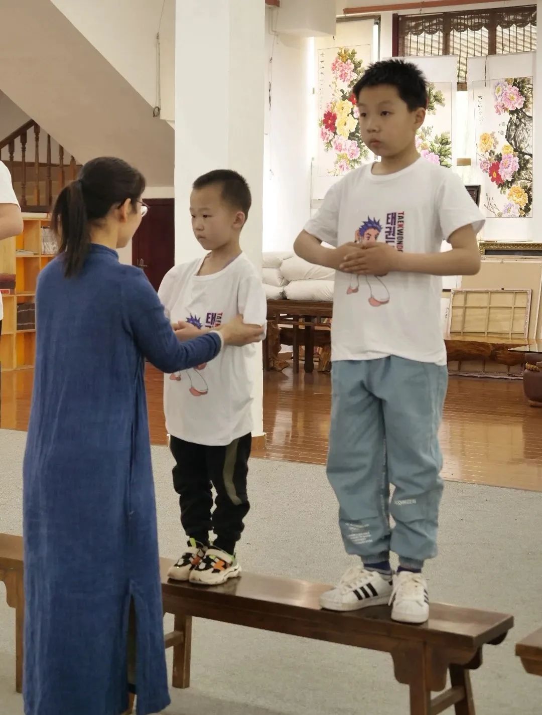 讓孩子們進(jìn)行武術(shù)基本動(dòng)作練習(xí)、五步拳練習(xí)(以基本手型和基本步型為基礎(chǔ))。在這個(gè)過程中,激發(fā)孩子習(xí)武強(qiáng)身的興趣,培養(yǎng)孩子自主學(xué)習(xí)、樂于合作、不怕吃苦的意識(shí)。