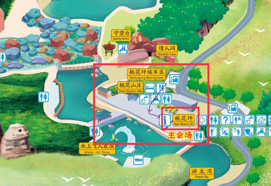 從景區(qū)游客中心坐小交通到達桃花坪候車區(qū),下樓梯后往桃花坪方向前進即可到會場區(qū)。