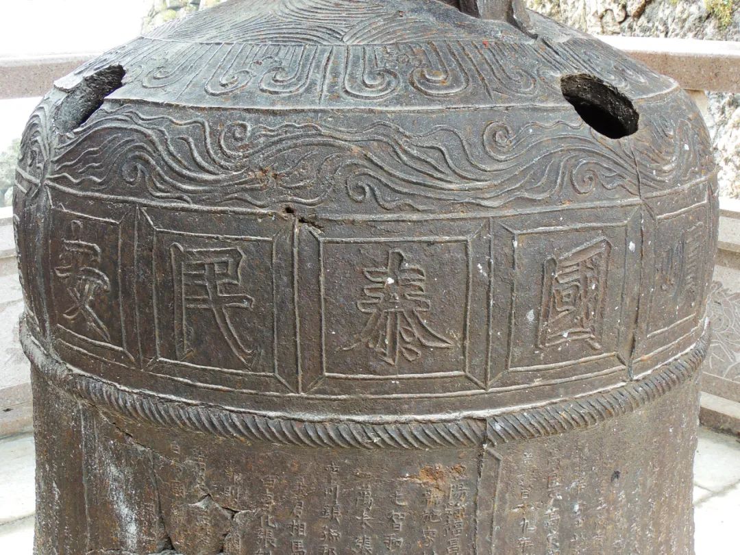 鐘上小楷字為各地信士捐資名錄,因年代較遠(yuǎn),被風(fēng)雨剝蝕,難以辨認(rèn)。
