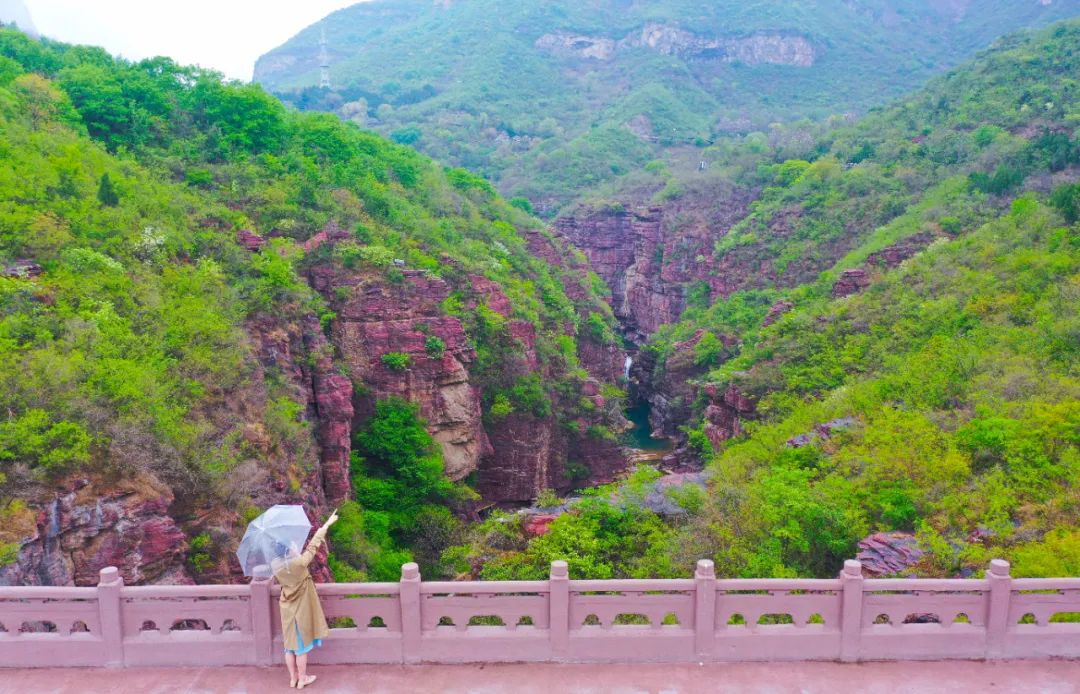 紅石峽丹崖如霞似火,碧潭幽谷在春雨的浸潤下綻放出神秘色彩。