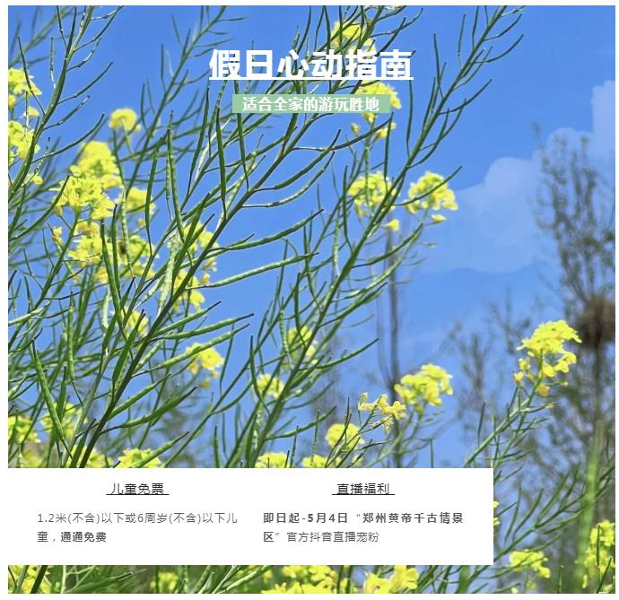 在春夏之間五月悄然而至,一年中清爽生動的出游時節(jié)由此開啟,踏青看秀趣游園、游玩吃購一站式全攻略,五一假期來鄭州黃帝千古情景區(qū),足不出市就能輕松get√假日好去處,全家老小都滿意!