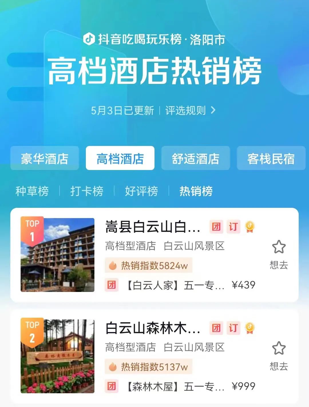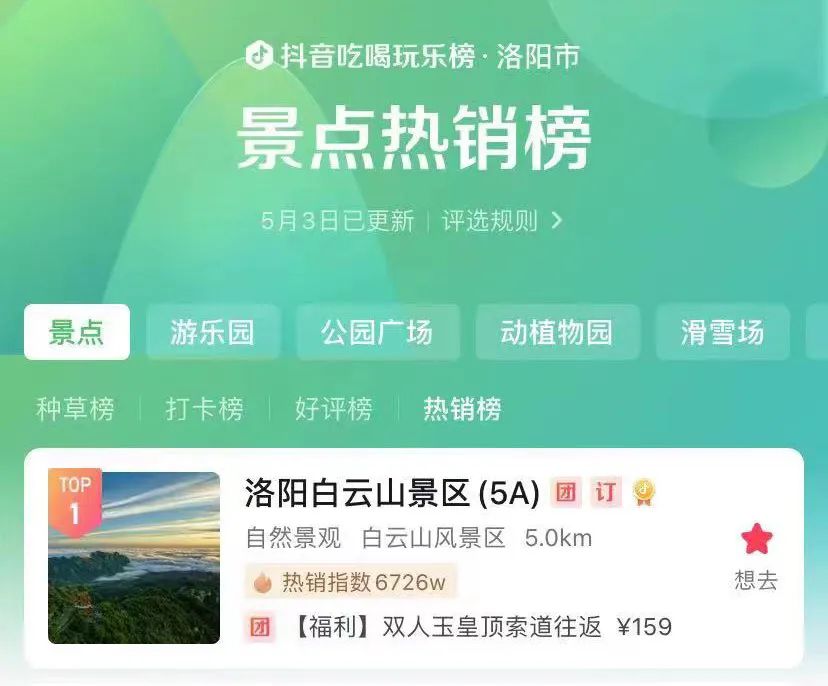 “直播間的朋友們給主播點(diǎn)點(diǎn)關(guān)注、點(diǎn)點(diǎn)贊,點(diǎn)擊下方‘小房子’就有‘五一’酒店住宿優(yōu)惠產(chǎn)品······”4月22日起,白云山旅游度假區(qū)官方直播間持續(xù)進(jìn)行“五一”特惠專場(chǎng)銷售,充分利用抖音的宣傳轉(zhuǎn)化優(yōu)勢(shì),讓洛陽(yáng)游客全面了解了假期的防疫政策、優(yōu)惠政策、游覽攻略,在春日美景和優(yōu)惠政策的雙重吸引下直接促進(jìn)了銷售轉(zhuǎn)化。在沒(méi)有任何商業(yè)投流的情況下,白云山旅游度假區(qū)官方抖音直播間7天GMV突破100萬(wàn),酒店住宿70%以上通過(guò)抖音預(yù)訂,抖音索道產(chǎn)品核銷率高達(dá)85%。為加大抖音直播宣傳力度,4月30日度假區(qū)迅速創(chuàng)建了2個(gè)子賬號(hào),5月1日起三個(gè)主播同時(shí)在景區(qū)不同景點(diǎn)開播,短短3天子賬號(hào)粉絲增長(zhǎng)均破千,4月22日至5月3日,白云山旅游度假區(qū)官方賬號(hào)、子賬號(hào)累計(jì)直播場(chǎng)觀50萬(wàn)人,且包攬洛陽(yáng)景點(diǎn)熱銷榜、高檔酒店熱銷榜“雙榜首”——洛陽(yáng)白云山景區(qū)以6726w熱銷指數(shù)排名洛陽(yáng)景點(diǎn)熱銷榜第一名,白云人家度假酒店以5824w熱銷指數(shù)排名洛陽(yáng)高檔酒店熱銷榜第一名。