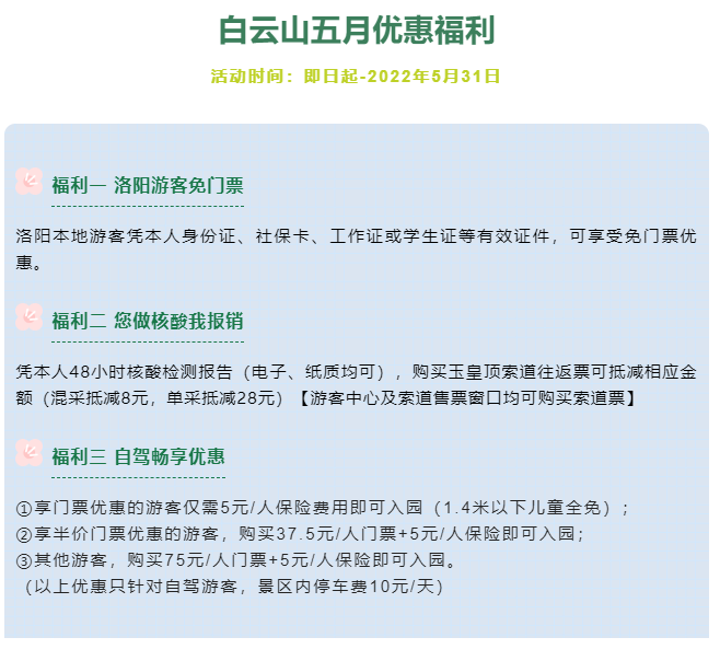 受疫情因素影響,跨省游、省內(nèi)跨地市出游不同程度受限,為滿足洛陽(yáng)本地游客假期游玩出行的需求,白云山推出了“你做核酸我報(bào)銷”、“洛陽(yáng)游客免門票”、“自駕白云天路”等多重春游特惠“大禮包”。此外,為更好地服務(wù)游客,堅(jiān)守誠(chéng)信經(jīng)營(yíng)的企業(yè)理念,度假區(qū)將2021年白云山年卡、牛氣卡的使用期限再次延期,延至2022年9月30日,包含周末、節(jié)假日,也收獲了網(wǎng)友的一致好評(píng)。