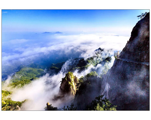 沿著懸空棧道暢游,一面是青山,一面是云海,云淡風(fēng)輕,讓人一不小心就沉醉在這仙境般的老君山里。