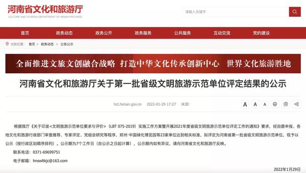 堅(jiān)持以人為本、服務(wù)優(yōu)先,切實(shí)加強(qiáng)文明旅游的體系建設(shè)和職業(yè)道德。2022年1月29日,景區(qū)被河南省文化和旅游廳授予首批省級(jí)文明旅游示范單位稱號(hào)。