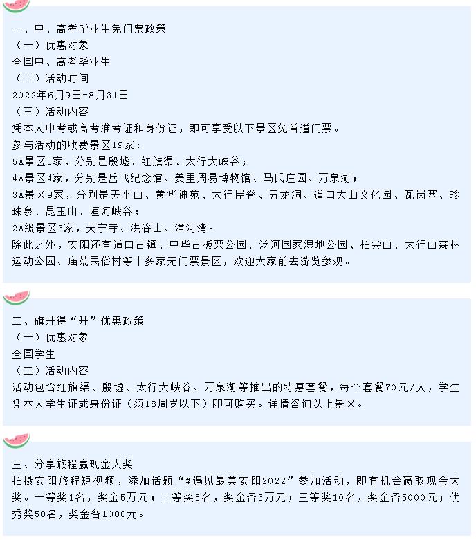 為迎接黨的二十大勝利召開,助力“行走河南·讀懂中國”品牌體系建設(shè),向年輕人講好中國故事,安陽市舉辦“全國學(xué)子游安陽”2022快手網(wǎng)紅文旅大會(huì)暨遇見最美安陽短視頻大賽活動(dòng)。為讓廣大學(xué)子暢享古都之旅,在畢業(yè)季到來之際,安陽針對(duì)全國中、高考畢業(yè)生推出系列優(yōu)惠政策,內(nèi)容如下: