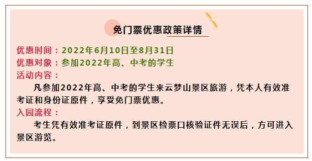 暑期來臨,為讓學(xué)子們能輕松游、優(yōu)惠游,云夢(mèng)山景區(qū)特針對(duì)中、高考生推出,免門票優(yōu)惠政策!