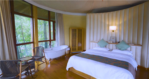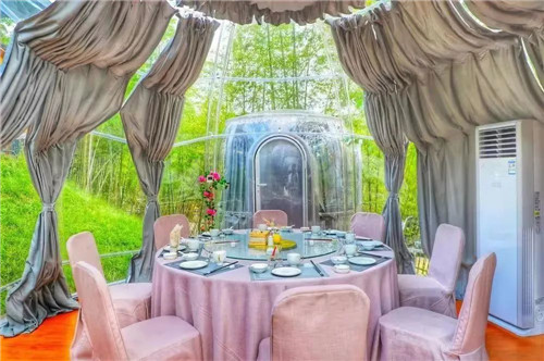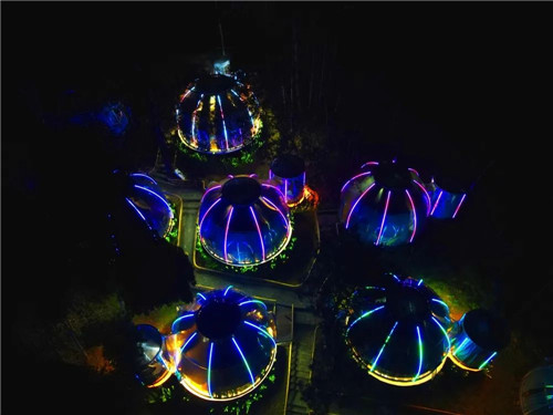 到了晚上,發(fā)光的墻壁將泡泡屋襯托的如星辰般繽紛耀眼,躺在床上,望著天窗,伴隨著星星,愜意的進入夢鄉(xiāng)。