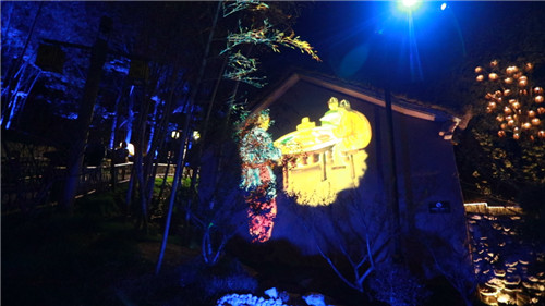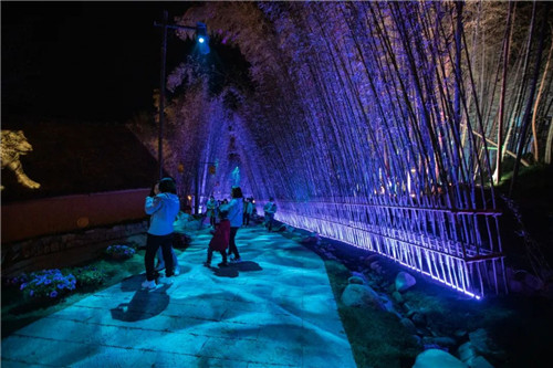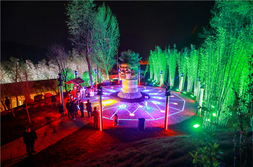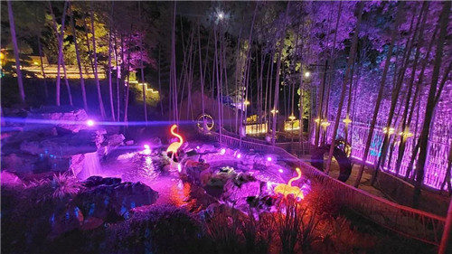 竹寨里,燈光下,炫麗道路,美麗燈光池,五彩斑斕的小鹿。