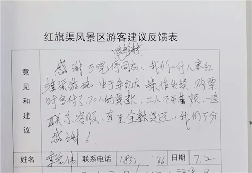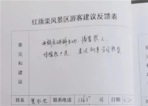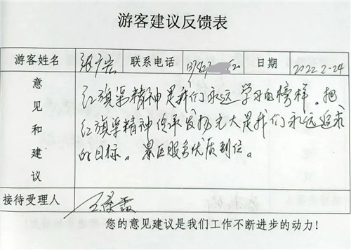 工作人員貼心細(xì)致的服務(wù)溫暖了游客的心,游客的暖心回復(fù),讓紅旗渠精神傳承者的步伐更加堅(jiān)定!