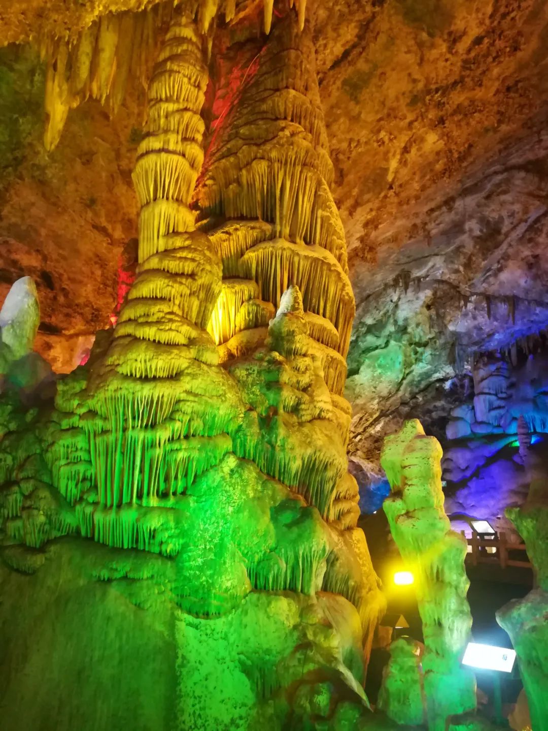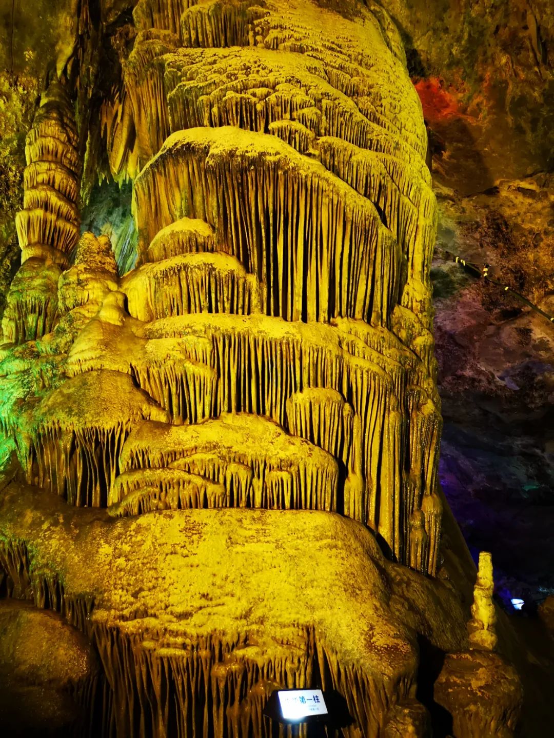 來到中華第一柱前,但見一柱擎天,氣勢(shì)恢弘。那種震感,會(huì)讓你的心海激起萬丈高浪。洞頂?shù)牧魉耆f年在堅(jiān)持不懈地滴落,地上的石筍在一點(diǎn)一滴慢慢地生長(zhǎng),最后它終于長(zhǎng)成了擎天巨柱,并以它的恢弘大氣,支撐著這個(gè)2萬多平米幽深壯闊的地下世界。柱高四五十米,柱身細(xì)密的鐘乳石層層疊疊披掛,一條巨龍隱隱在柱身盤旋。龍首低回,龍尾勁掃,似在呼喚青云,與它相伴。暖暖的黃色燈光把柱身鍍上了一層金色,越發(fā)襯托出它不凡的氣度。在它跟前,人類顯得如此的渺小,望著它,敬畏之情暗生,虔誠(chéng)之意頓起。