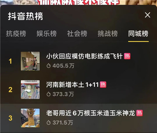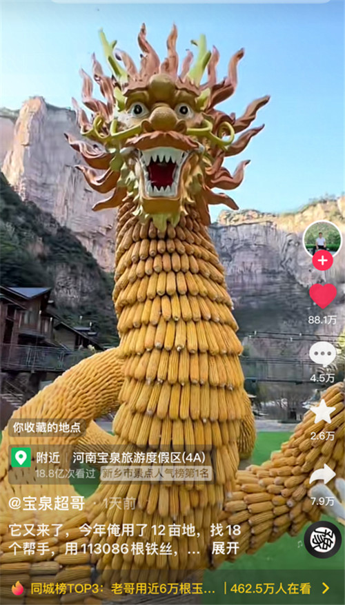 聚龍廣場(chǎng)的現(xiàn)場(chǎng)有一條玉米神龍,長(zhǎng)69米,高5.5米,由60235顆玉米、耗時(shí)15天打造而成!視頻發(fā)布后短時(shí)間內(nèi)獲取3000萬次播放量!登上抖音同城熱榜!并引起了廣泛媒體關(guān)注。
