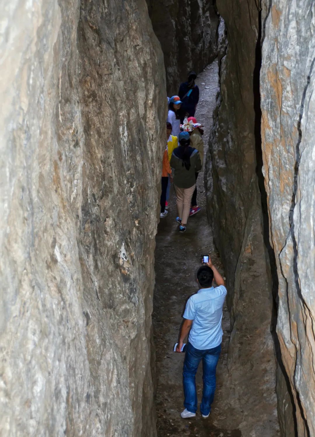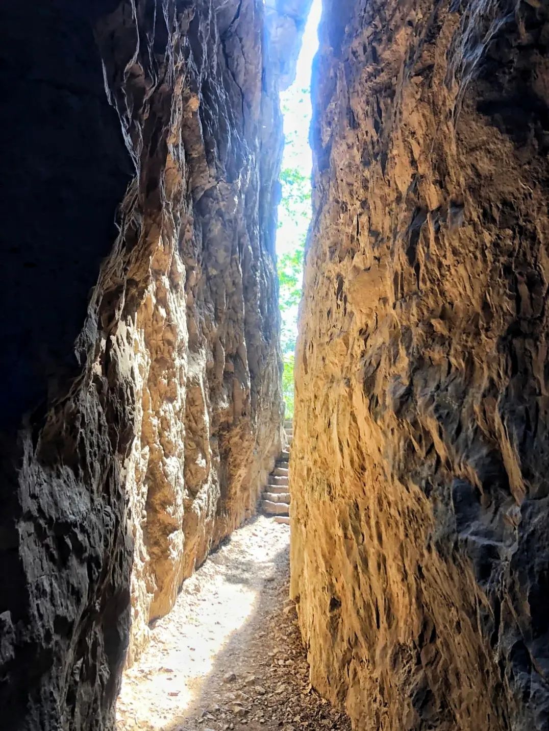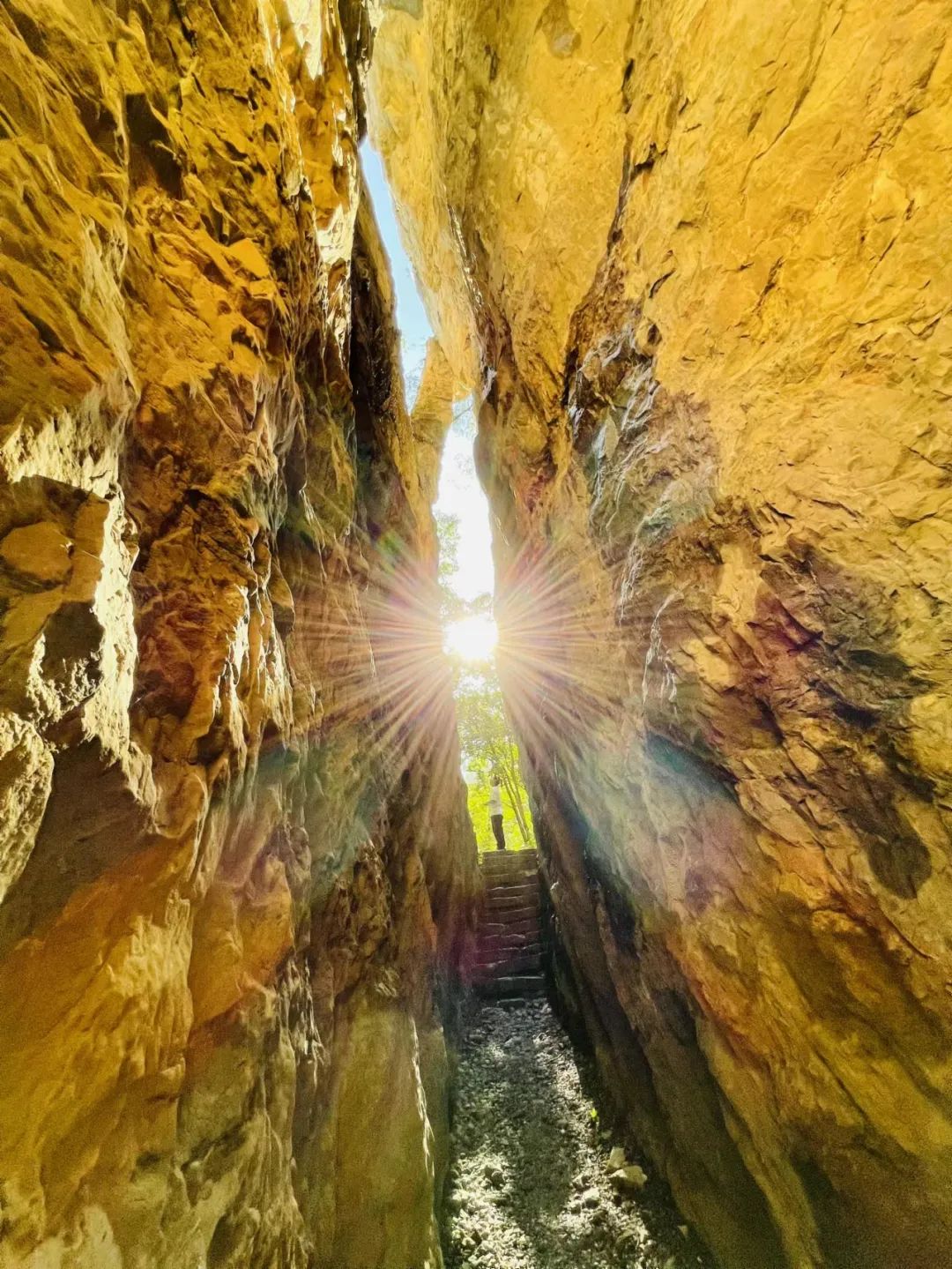 關(guān)山的一線天寬約一米,抬頭只能看見一米的天空,享受一米寬的陽光,所以也叫“一米陽光”。