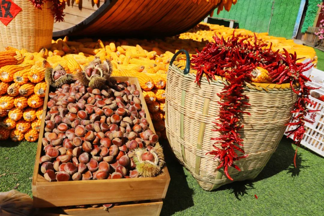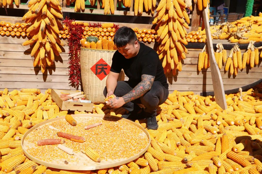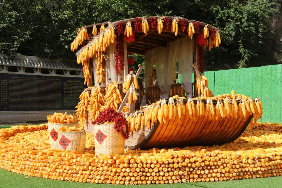 一艘象征著豐收的木船,徜徉在玉米棒堆成的“海洋”里,周?chē)c(diǎn)綴著紅紅火火的辣椒串,濃烈的豐收氛圍展現(xiàn)在眼前,成了今天的“網(wǎng)紅”拍照打卡點(diǎn)。